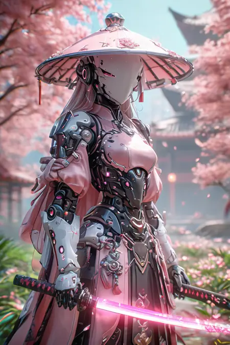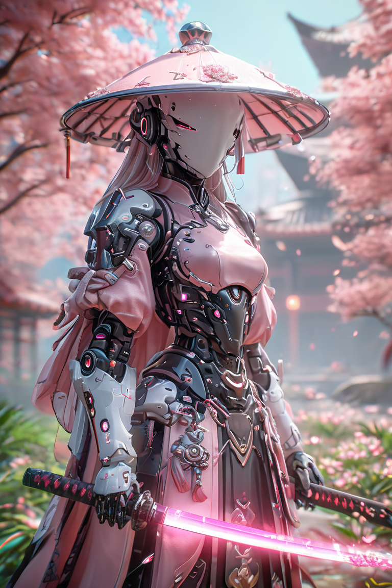 "score_9, score_8_up, score_7_up, score_6_up, score_5_up, score_4_up,(Female cyborg samurai character from Genshin Impact, wearing pink and white with an Asian style hat on her head, in the style of cyberpunk with robot body parts and high tech mechanical armor, robot arms, holding a glowing katana, standing im a magical flower garden, HD, masterpiece, best quality, hyper detailed, ultra detailed:1.2)"