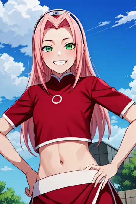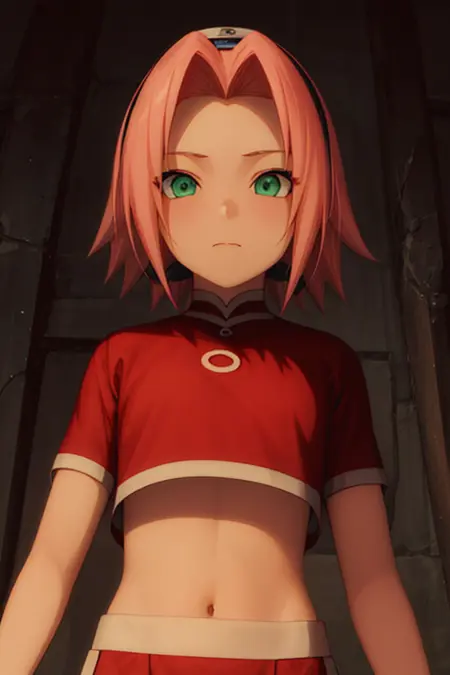 Trigger word is "haruno sakura" and "crop top, navel, midriff, red shirt, red skirt, short sleeve"