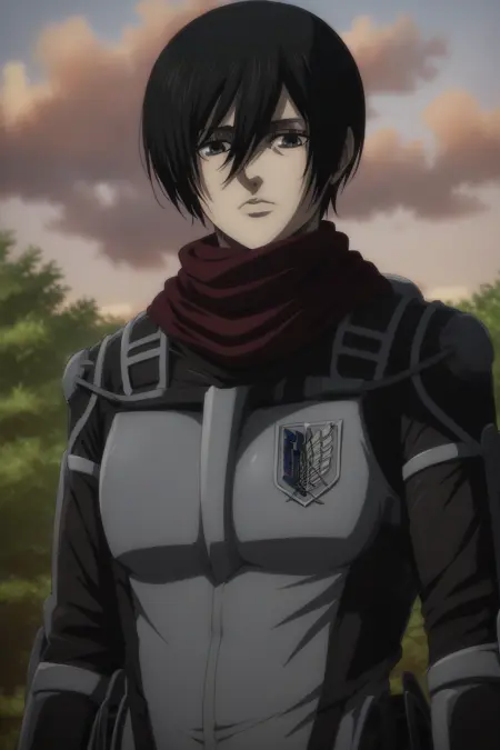 ,mikasa_v1, mikaa、短髪、エンブレム、黒目、額に髪がかかる、パラディス軍服、シングル、1girl、短髪、エンブレム、赤いスカーフ