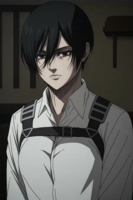 mikasa_v1, mikbb, 1girl、シングル、黒髪、短髪、シャツ、胸、白いシャツ、額に髪がかかる、黒目