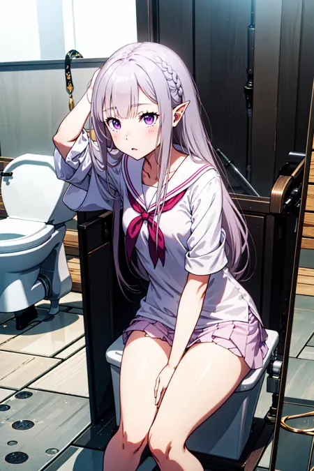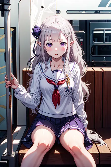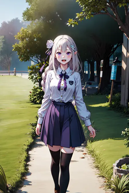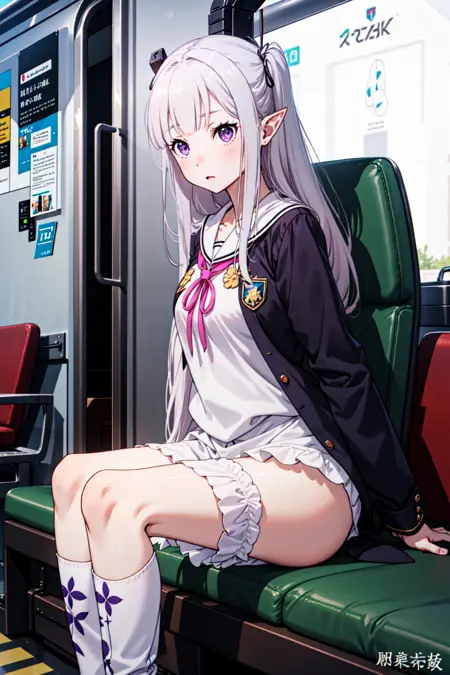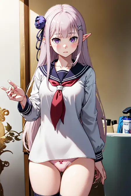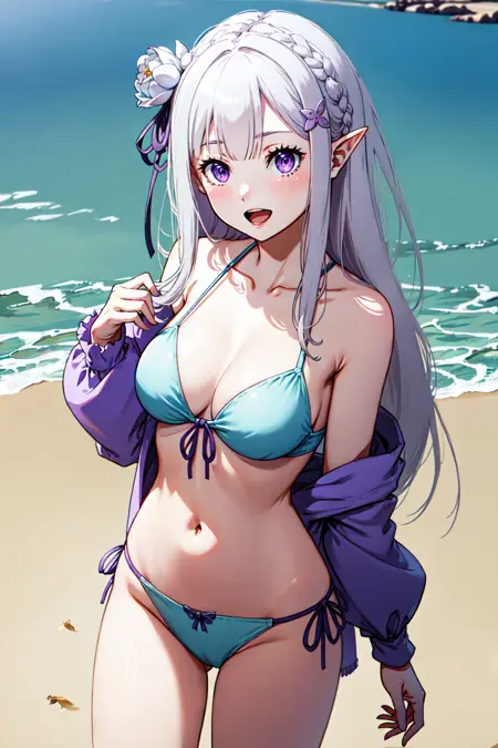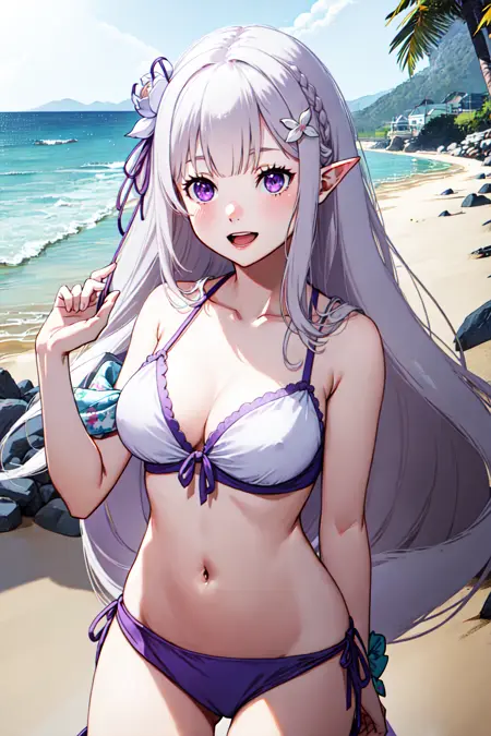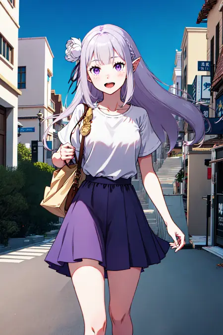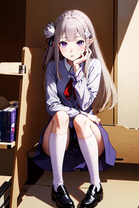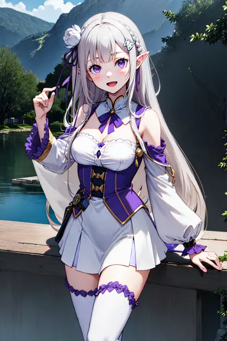 📌提示词:艾米莉亚,emilia_(re:zero),长发,银发,齐刘海,辫子,发饰,发花,发带,紫色发带,紫色眼睛,红晕,低扎长发,精灵
