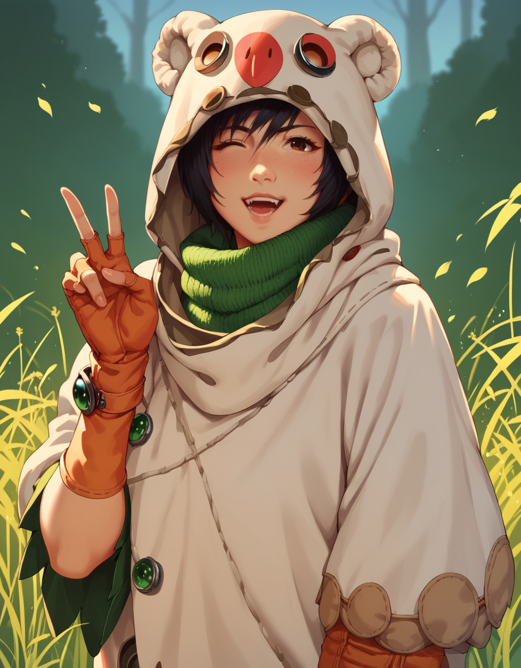 프롬프트 없을 시 유피는 스웨터를 입습니다. "Moogle outfit, hood, cowl" 프롬프트를 사용하면 무글 옷을 입습니다.