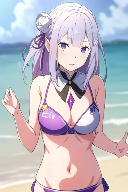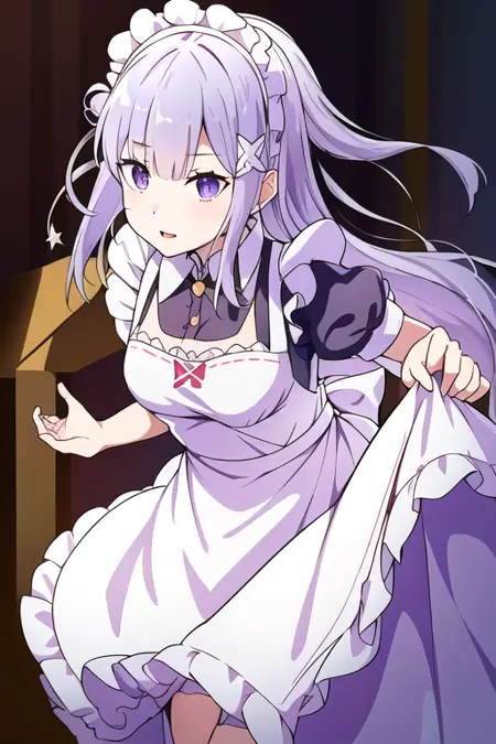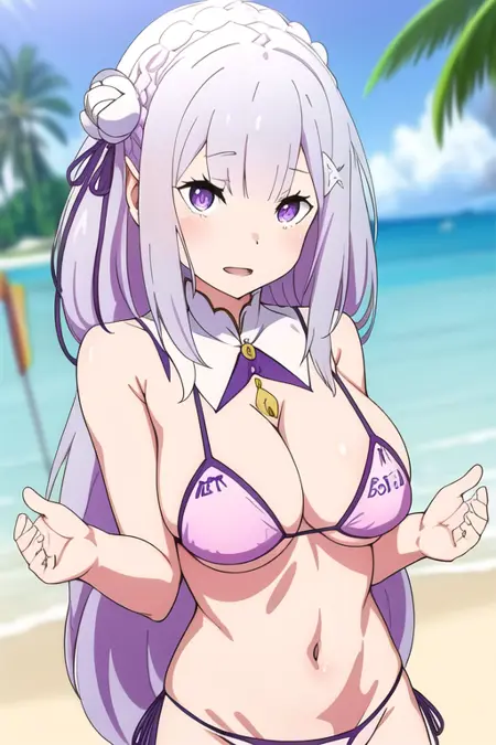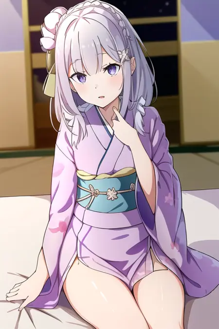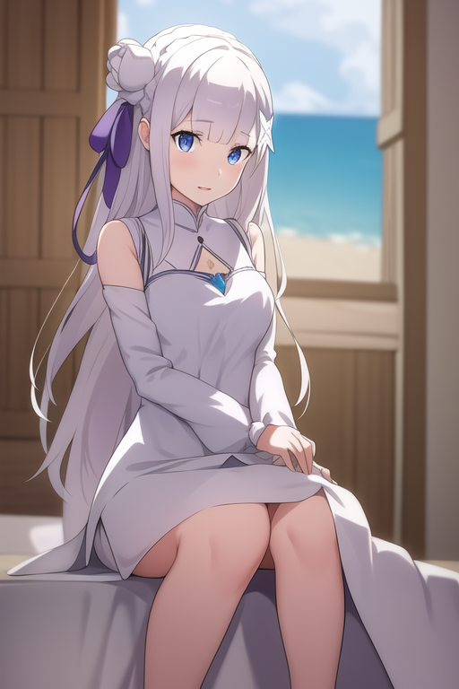 📌 프롬프트: 에밀리아, 에밀리아_(리:제로), 긴 머리, 은색 머리, 평행 앞머리, 꼬임 머리띠, 머리 장식, 머리꽃, 머리 리본, 보라색 리본, 보라색 눈, 얼굴에 핑크빛, 낮은 긴 머리 묶음, 엘프