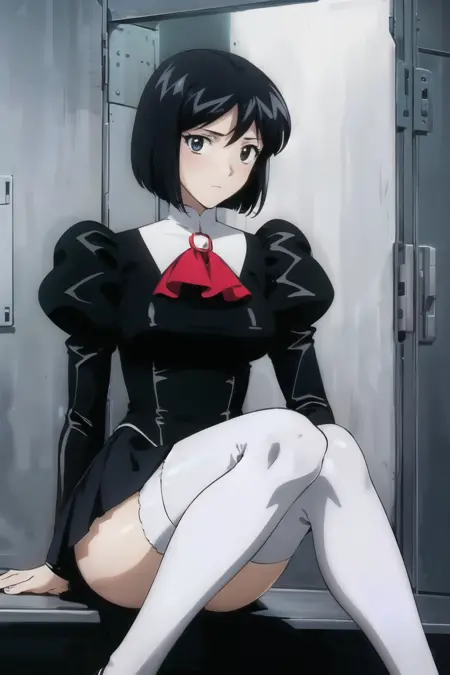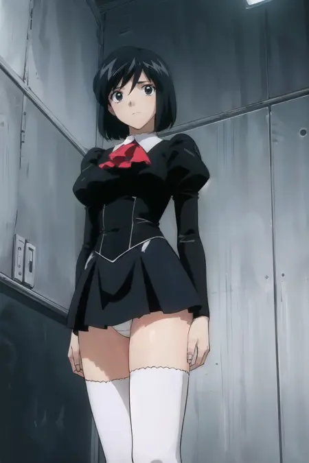 delmo: 부푼 소매, 유니폼, 검은 재킷, 빨간 애스컷, 줄리엣 소매, 주름치마, 흰색 허벅지까지 긴 양말