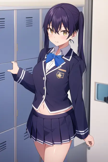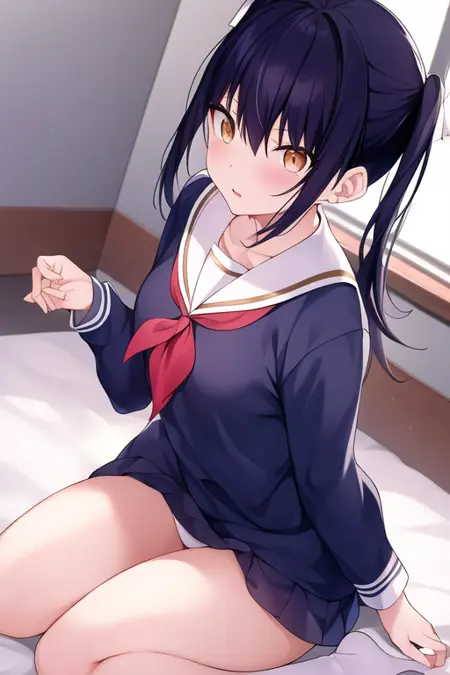 타마키 코타츠크, 턱밑 머리끈, 검은 털, 긴 머리, 앞머리, 얼굴 crimson, 주황 눈,