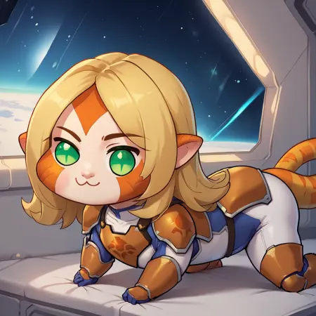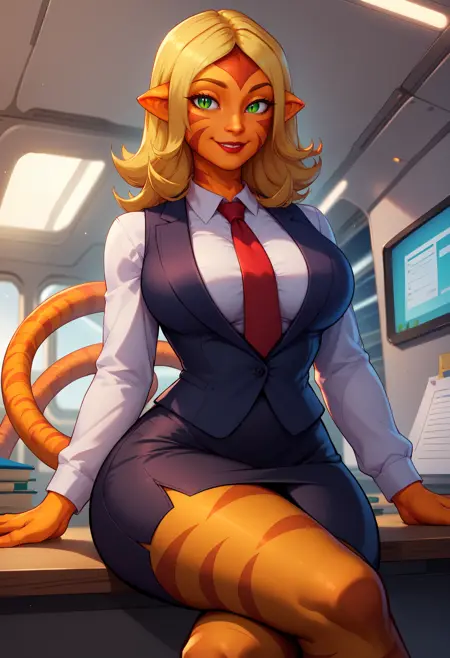触发词:"Kitraandra, 橙色皮肤, 尖耳朵, 尾巴, 绿色眼睛, 竖瞳, 面部纹身, 额头纹身, 条纹, 中长发, 金发" 必须始终使用。为获得准确体型请添加 "紧致, 大胸",为呈现她的红唇请添加 "口红"。