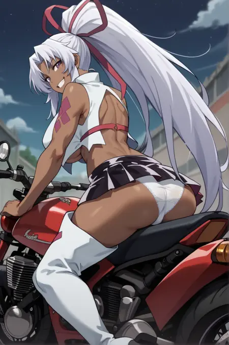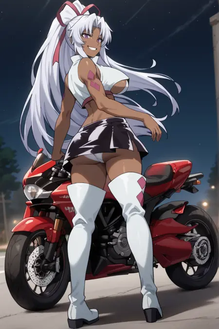 黒肌の女性、紫の目、非常に長い髪、高いポニーテール、白髪、長い髪、大きな胸、髪飾り、タトゥー衣装