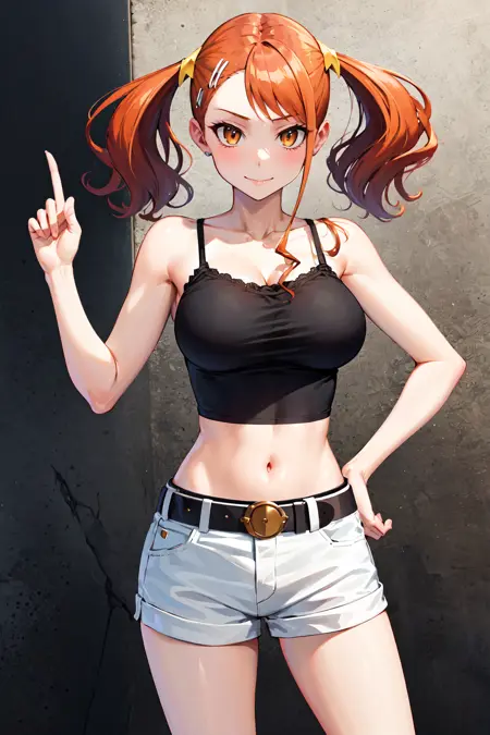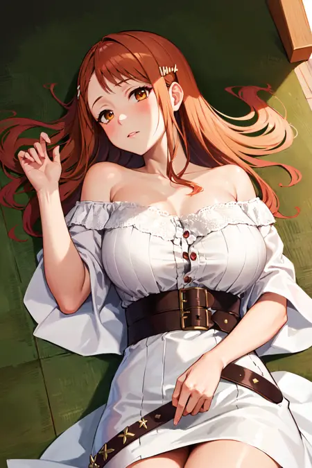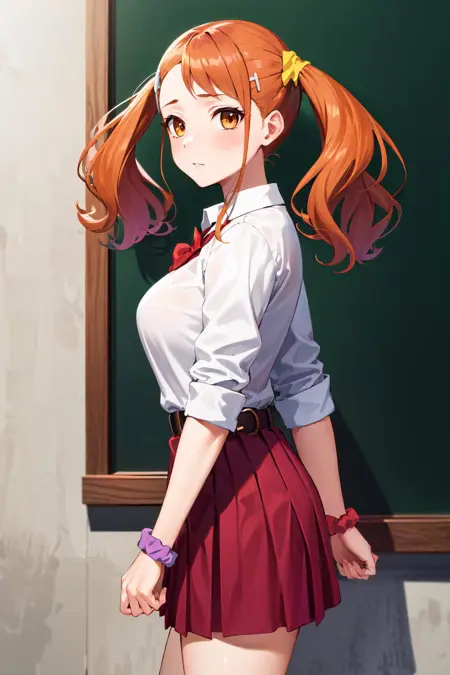 anjou naruko, ヘアクリップ, 袖をまくった状態, ウェストのスクラッチニー, ベルト, ホワイトシャツ, レッドスカート, スocks, ツインテール