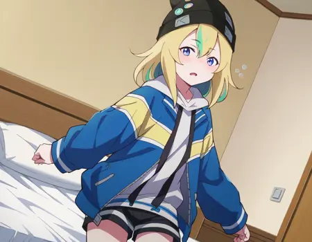 long sleeves, hat, jacket, shorts, hood, hoodie, hood down, blue jacket, beanie, drawstring,