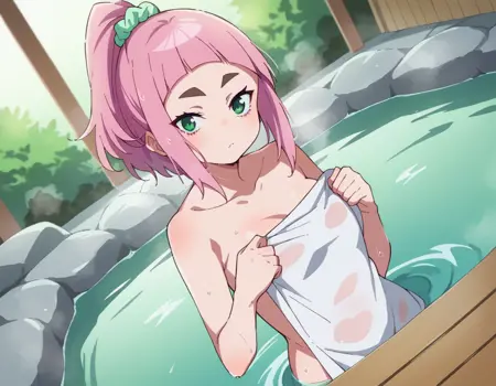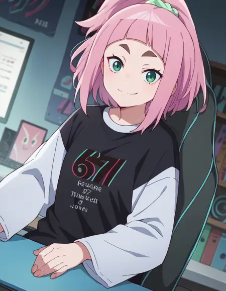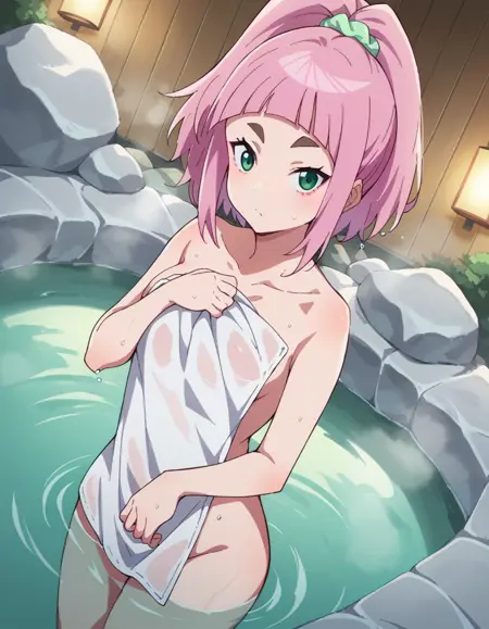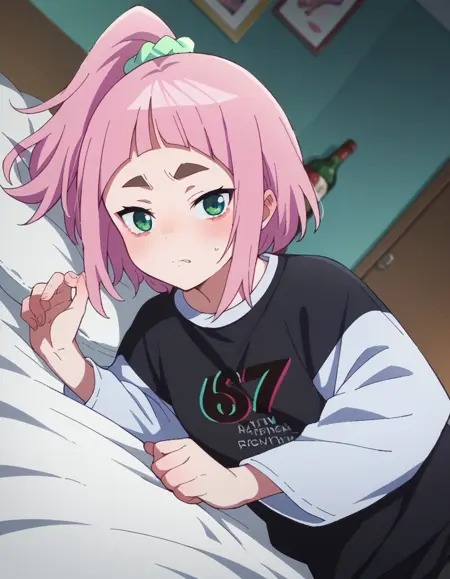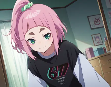kiui watase,短发,刘海,发饰,绿眼睛,粉发,浓眉,发圈,发圈,马尾,齐刘海,