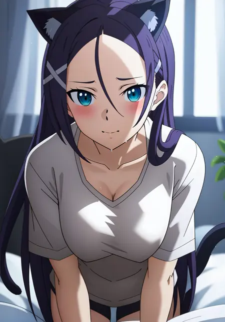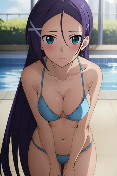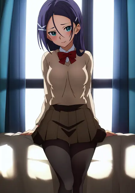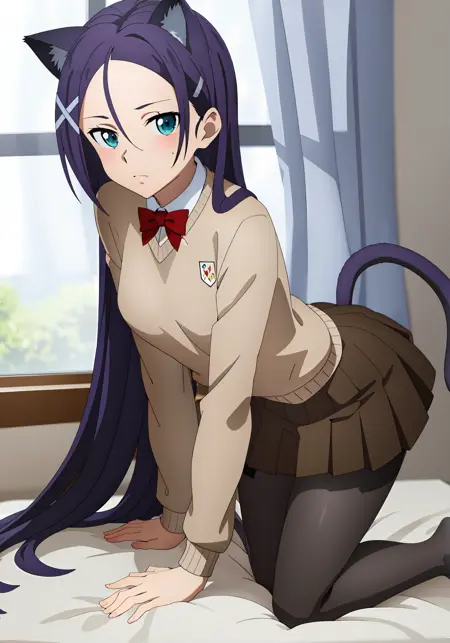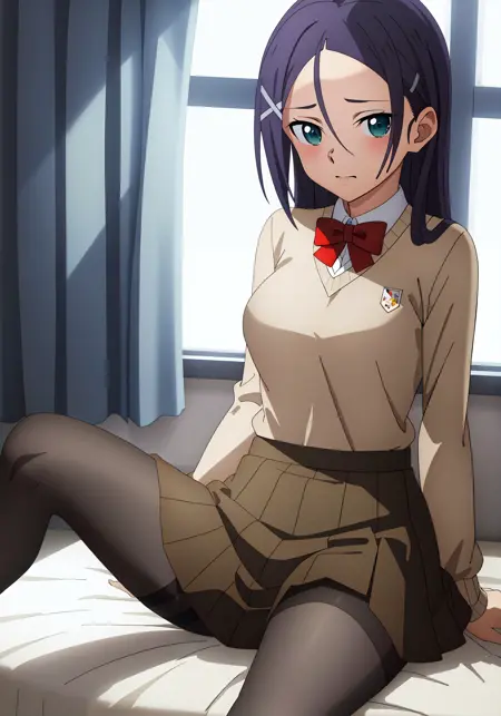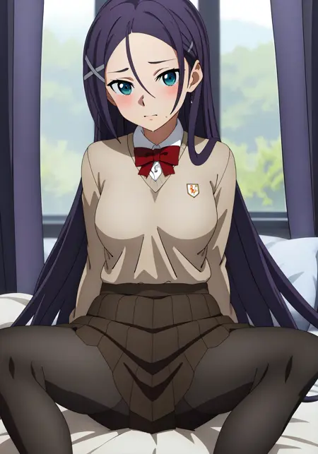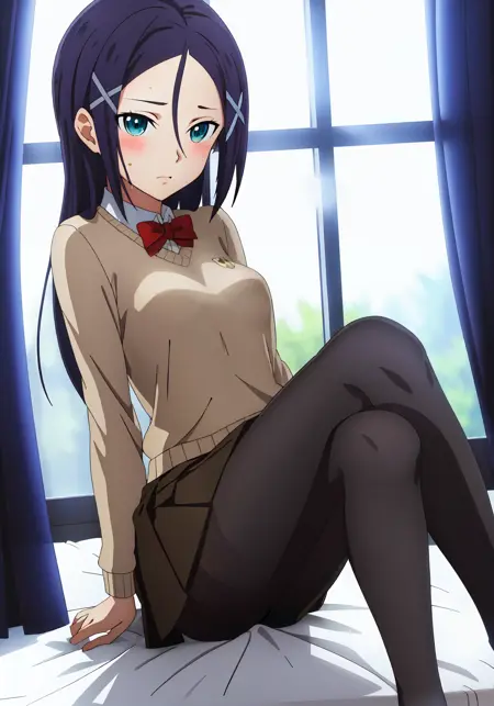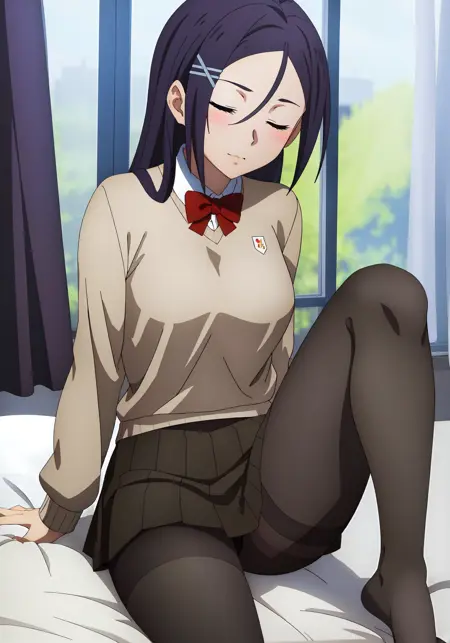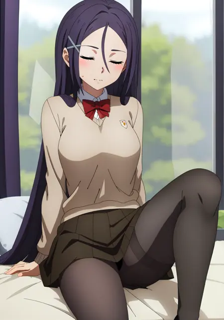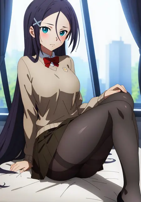 트리거 단어: brown_skirt, hair_ornament, hairclip, black pantyhose, pleated_skirt, bangs, long hair, red_bowtie, green eyes,