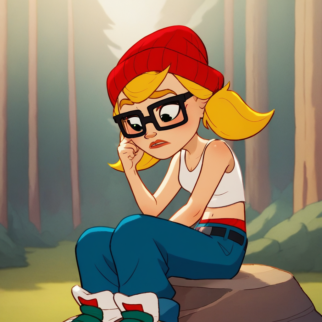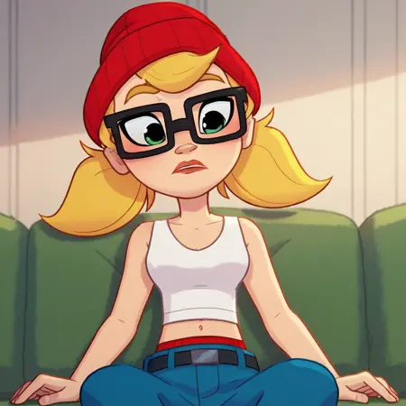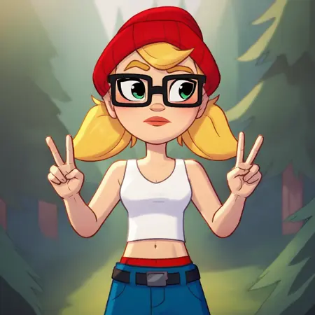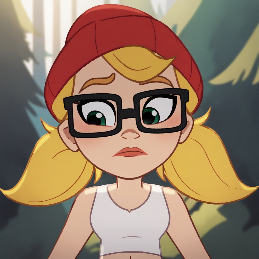 Tricky, 1girl, solo, blonde hair, twintails, green eyes, glasses, red beanie,