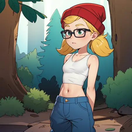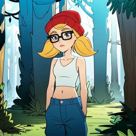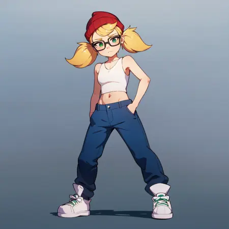 1girl, solo, Tricky, blonde hair, twintails, green eyes, glasses, red beanie, midriff, white crop top, tank top, blue pants,