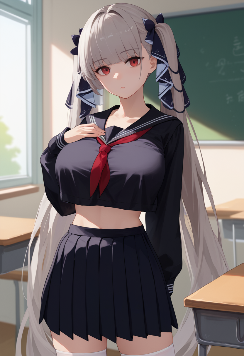 ** Duty 中悸动的爱人之心:** formidableschool, 灰色头发, 双马尾, 发带, 双色发带, 校服, 黑色水手服, 黑色衬衫, 露腹上衣, 黑色水手领, 红色领结, 长袖, 黑色短裙, 百褶裙, 白色长筒袜, 大胸