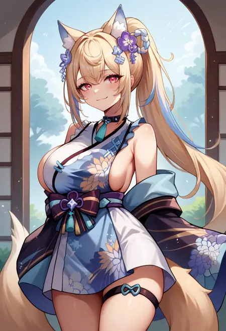 FuwawaNewYears, long hair, ponytail, streaked hair, kouhaku nawa hair bow, hair flower, spiked choker, neck tassel, tail, blue kimono, floral print, short kimono, sleeveless, single detached sleeve, blue sash, thigh strap