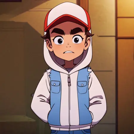 solo, 1boy, Jake, short hair, brown hair, thick eyebrows, black eyes, red cap, hood up, blue vest, white hoodie,
