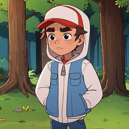 solo, 1boy, Jake, short hair, brown hair, thick eyebrows, black eyes, red white cap, jacket, hood up, blue vest, white hoodie,