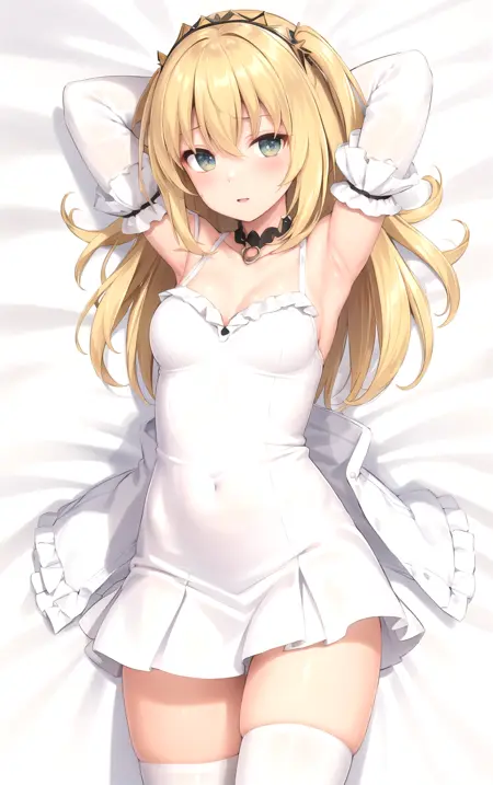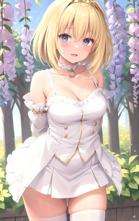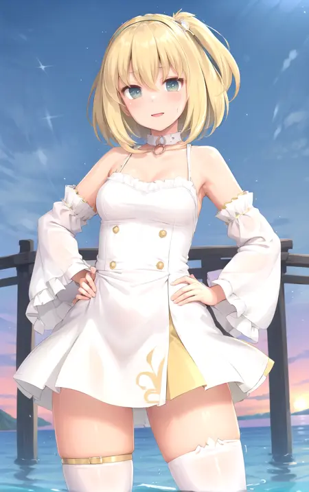 1girl, armlet, bangs, bare shoulders, blonde hair, collarbone, frills, hair between eyes, skirt, thighs, white jacket, wide sleeves, yellow thighhighs
