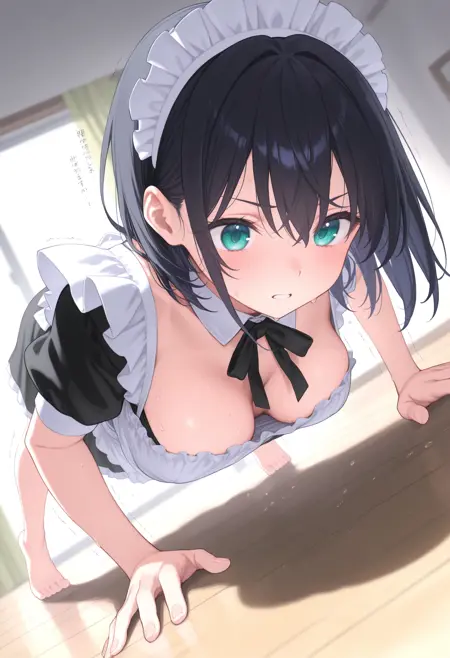 虽然不加也可以,但建议将sweat、exercise、all fours、arm support作为护身符加入。如果不喜欢生成巨乳,可以在负面提示中加入large breasts;反之,若想生成巨乳,可加入large breasts、on stomach、breast press,这样在某些随机结果下,弯曲手臂时胸部会被压扁。