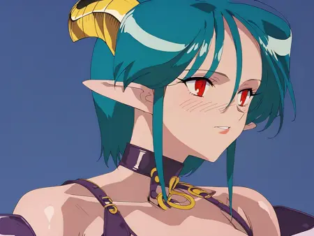viper_gts_carrera, aqua hair, green hair, short hair, pointy ears,red eyes, horns,choker,slit pupils, shiny skin,latex shiny purple bikini, purple gloves, purple thighhighs,demon tail,bare shoulder, purple highleg, large breasts, 1990s (style), retro artstyle,black background