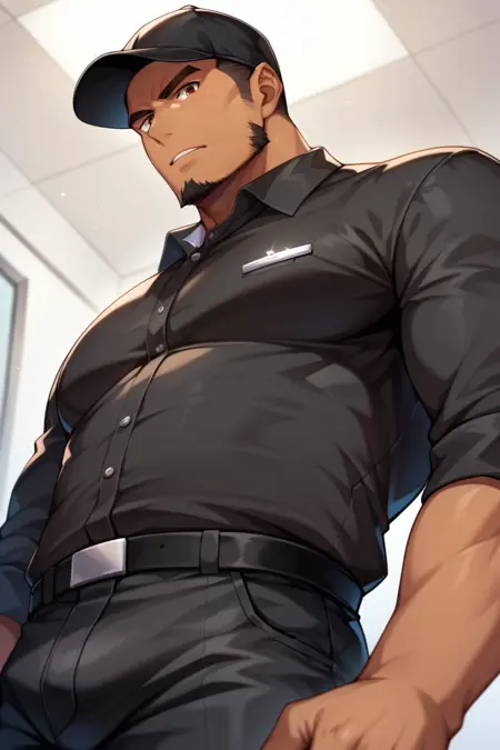 black Memory T Cell uniform \(Cells at Work\), black collared shirt, short sleeves, black cap, Memory T Cell cap \(Cells at Work\), black pants, black boots