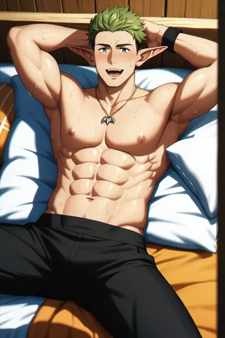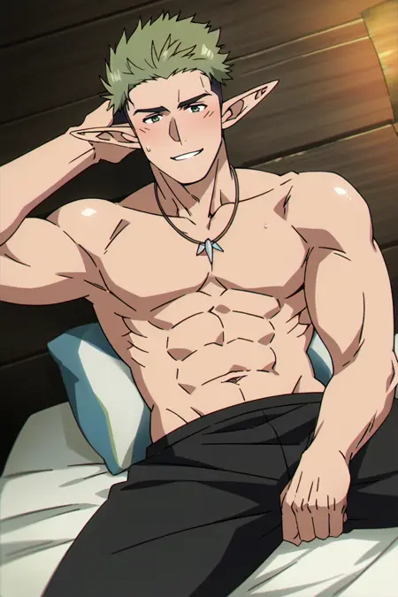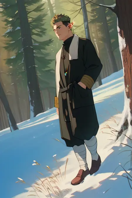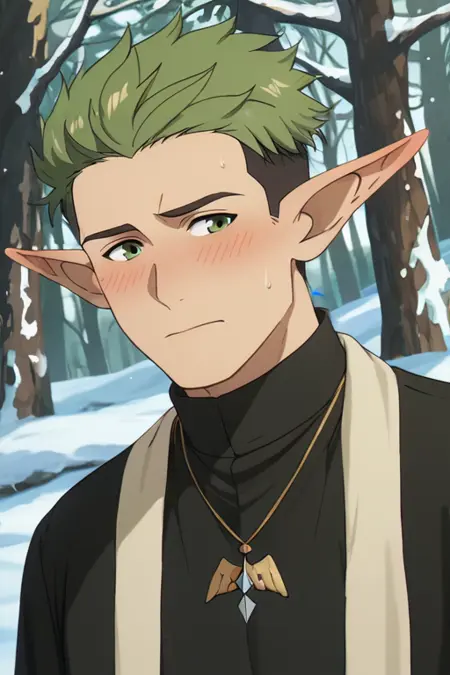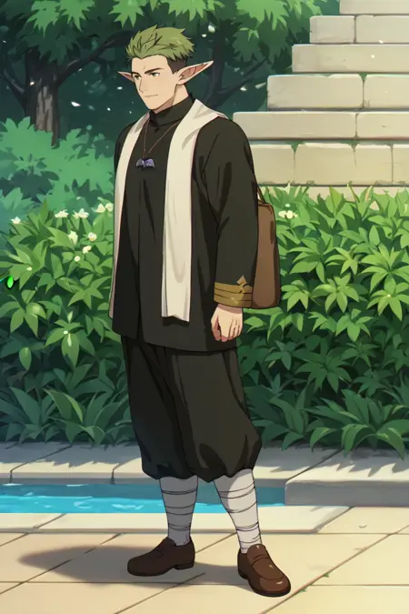 プロンプト: source_anime \(Frieren: Beyond Journey's End\), アニメ風カラー, クラフト, エルフ, 尖った耳, 緑の目, オリーブグリーンの髪, 短髪, アウトカット, ツートーンヘア, クラフトのローブ, 立ち襟ローブ, 黒いローブ, 短いローブ, 金飾り入りの黒いローブ, 閉じたローブ, クリーム色の聖職者用スカーフ(サッシュ), 広めの黒いズボン, 白いパッティ, 脚巻き, 茶色の靴, 創造の女神のネックレスの紋章 \(Frieren: Beyond Journey's End\)