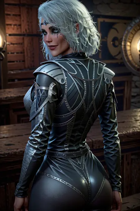 Main tag: "bg3is0bel, pointy ears, white hair, short hair, grey eyes, eye tattoo, black eyeshadow, circlet"
