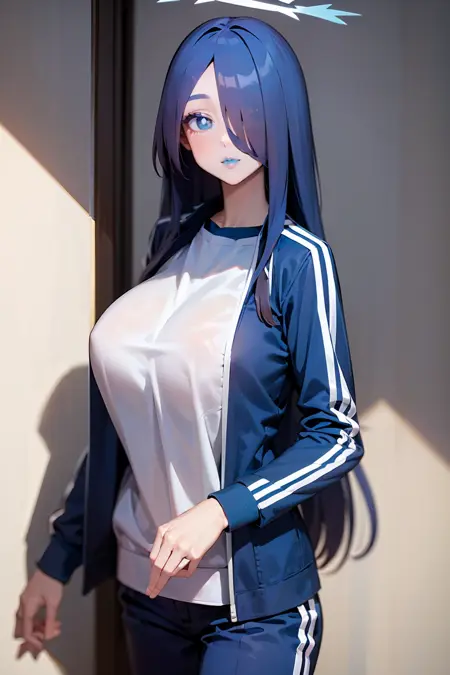 colored eyelashes, blue lips, huge breasts, long hair, blue halo, bright pupils, white pupils, hair over one eye