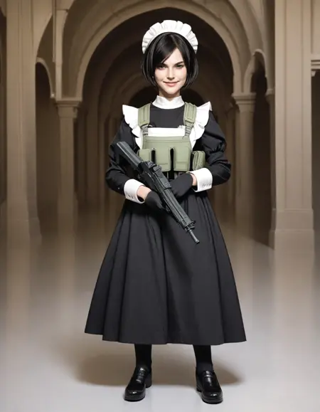 Outfit 1: maid, apron, maid apron, juliet sleeves, dress, long sleeves, puffy sleeves, frills, black gloves, tactical vest (optional), gun, (optional), body armor (optional)