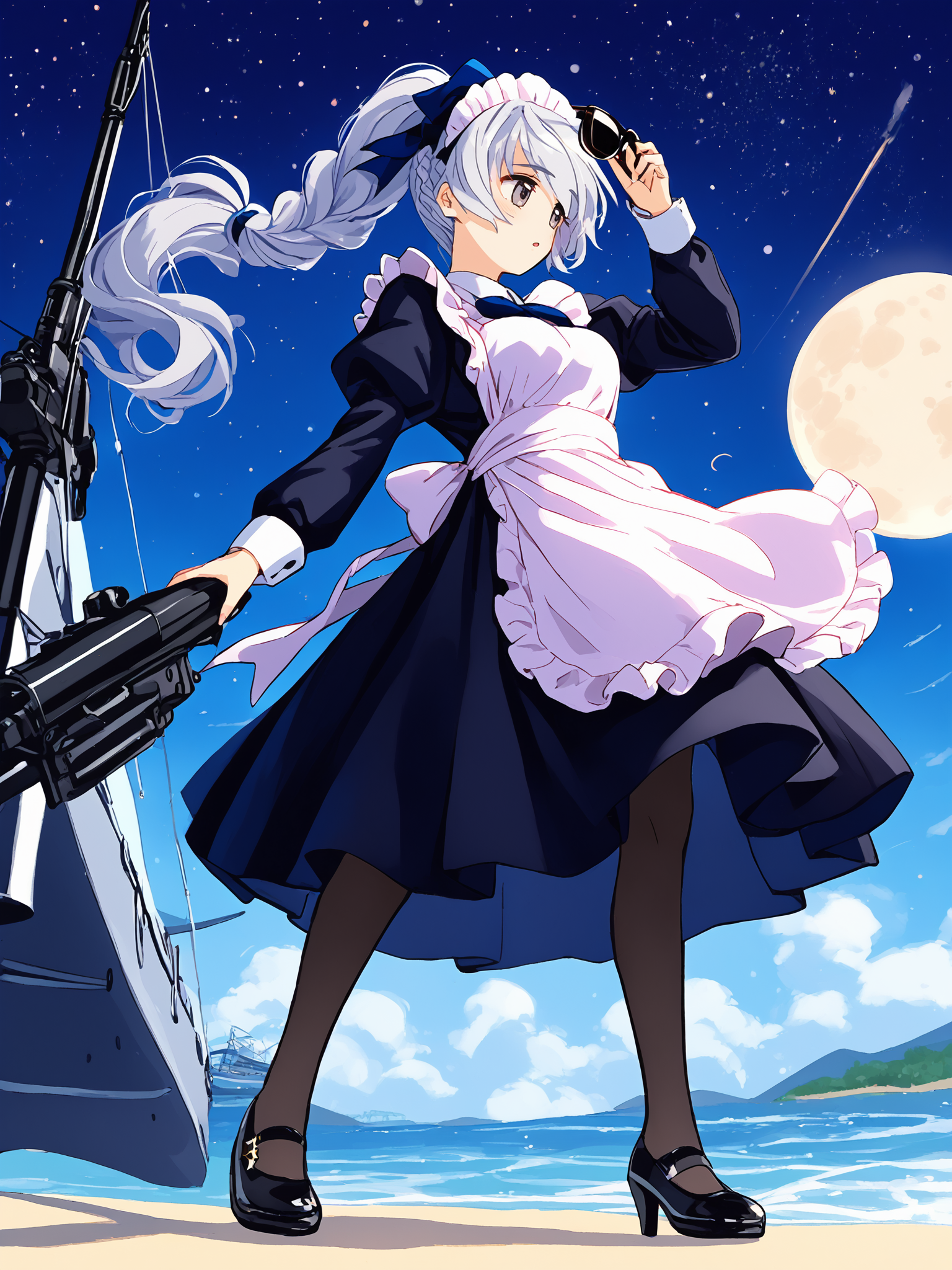 メイド衣装: telethamaid, 灰色の髪, 髪飾り, 灰色の目, (三つ編みポニーテール, 浮いている髪:1.2), 黒い靴, (ハイヒール:1.1), (メアリージェーンズ:1.5), (黒いドレス:1.2), ロングドレス, 茶色のパンティーホース, フリル, ペティコート, (メイドのエプロン, ロングエプロン:1.5), メイド頭飾り, 長袖, (白いボウタイ:1.2),