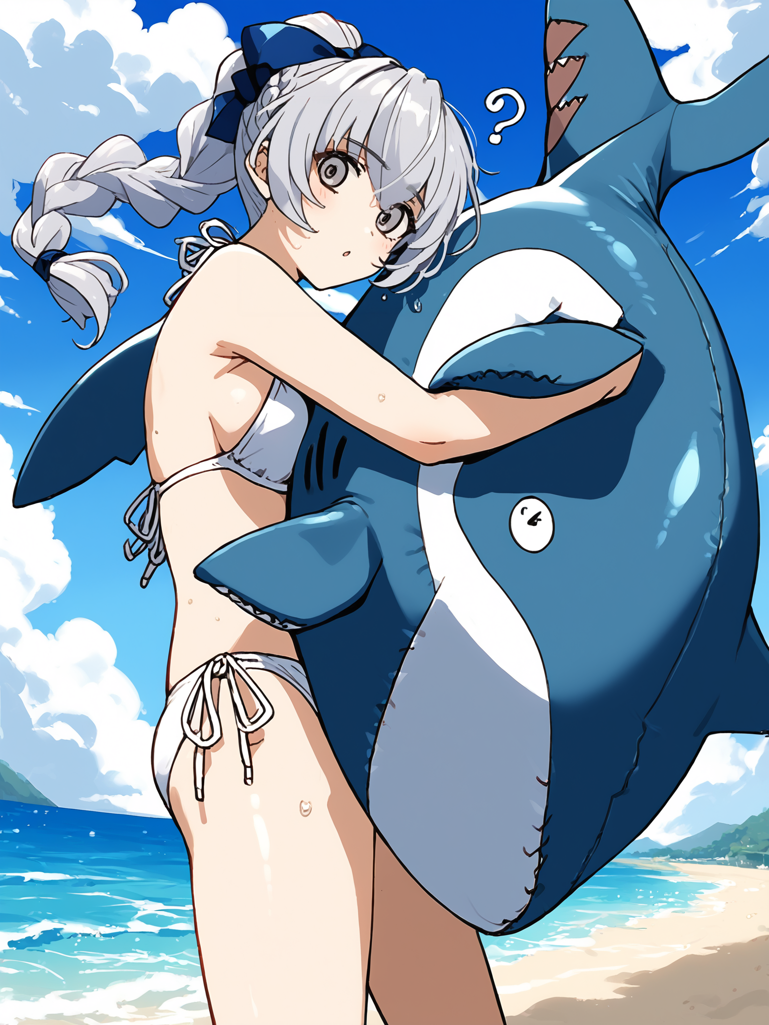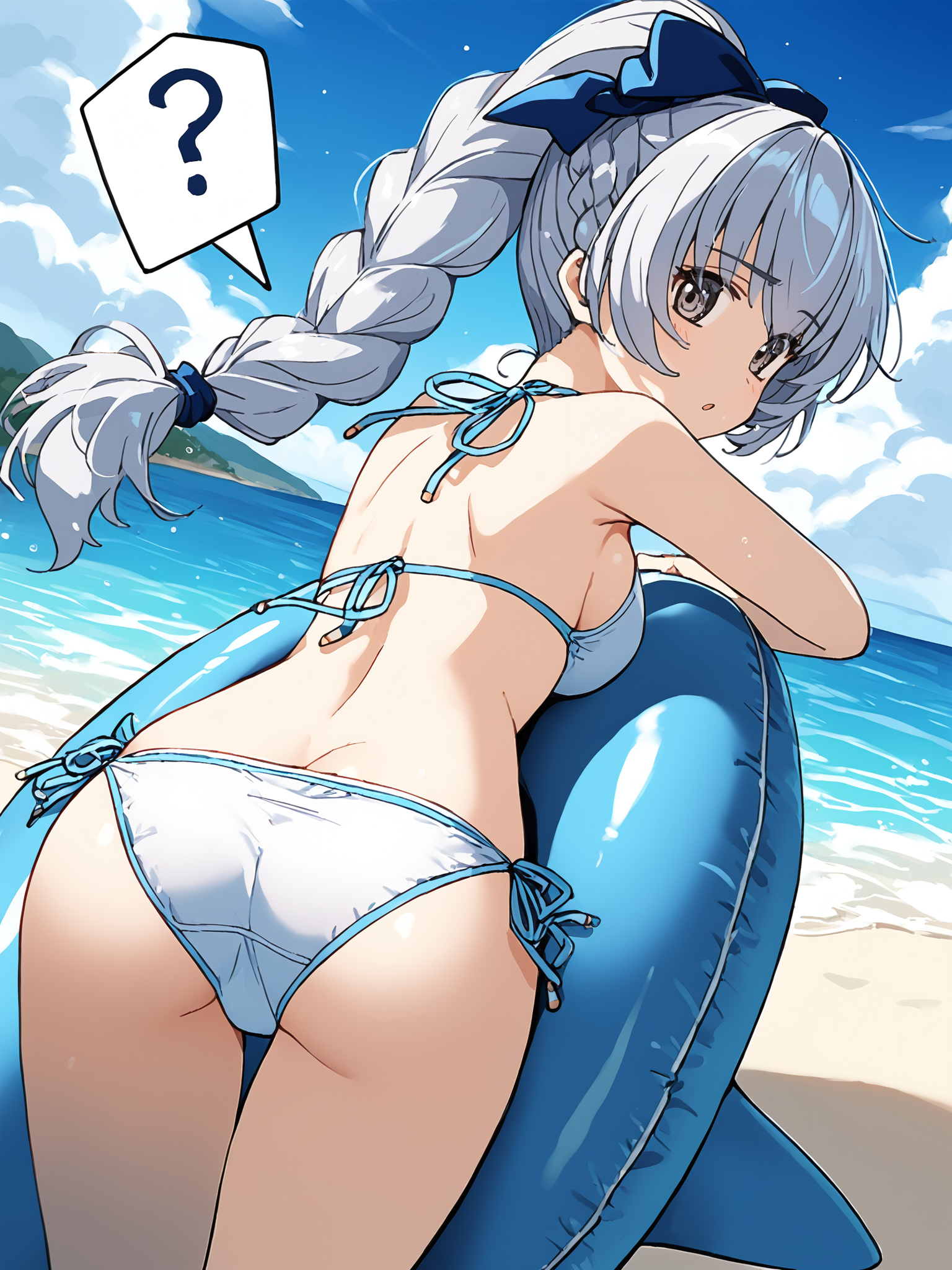 白色ビキニ: 灰色の髪, 灰色の目, 水着, 髪飾り, 青いリボン, 単一の三つ編み, 白いビキニ, サイドブーブ, サイドタイのビキニパンツ,