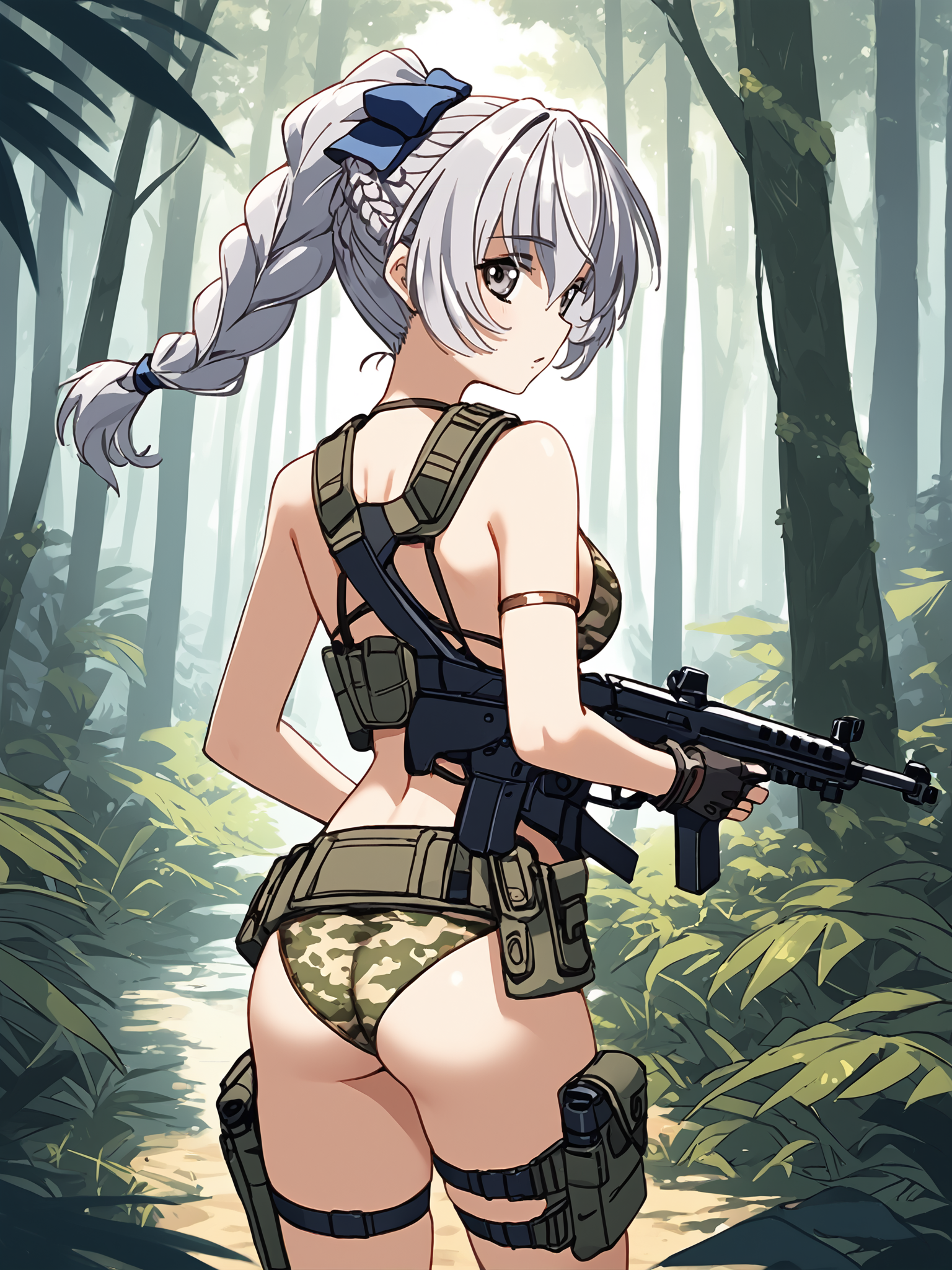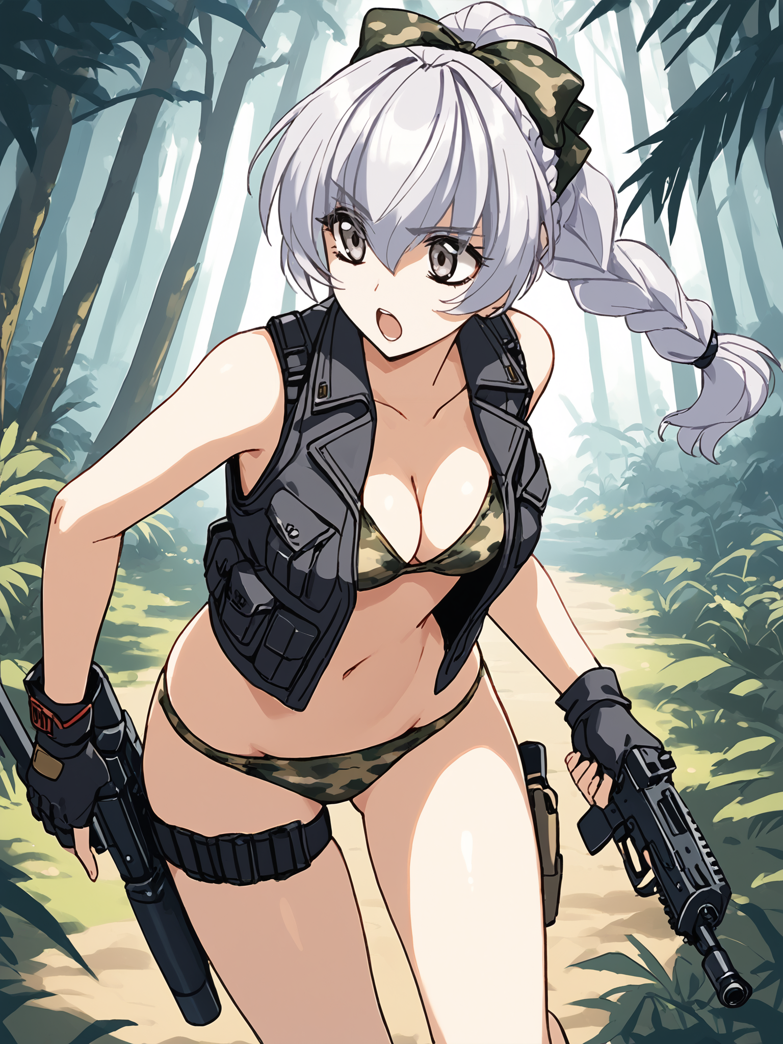 迷彩柄ビキニ: 水着, 灰色の髪, 三つ編み, 武器, (迷彩柄ビキニ:1.5), 小さな胸, (胸元:1.3), フィンガーレスグローブ, 灰色の目, 銃, ライフル, ハンドガン, (アサルトライフル:1.2), トリガー・ディシプリン, (太ももホルスター:1.3), (黒いベスト, シャツなしベスト:1.5), (迷彩柄リボン, 暗緑色リボン:1.3),
