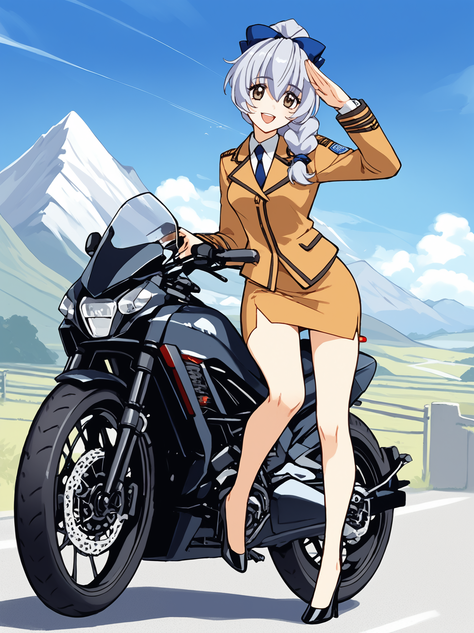 ミリタリー制服: telethacapn, 長袖, 白シャツ, ポロシャツ, 灰色の髪, 三つ編み, 髪飾り, ネクタイ, 灰色の目, 三つ編みポニーテール, 青いリボン, ミリタリー制服, ウィングカラー, 黒ネクタイ, 髪が肩にかかる, 茶色のジャケット, 茶色のスカート, 鉛筆スカート, ミニスカート, エンブレム, 太もも, 裸足, 黒い靴, (ハイヒール:1.5), パンプス,