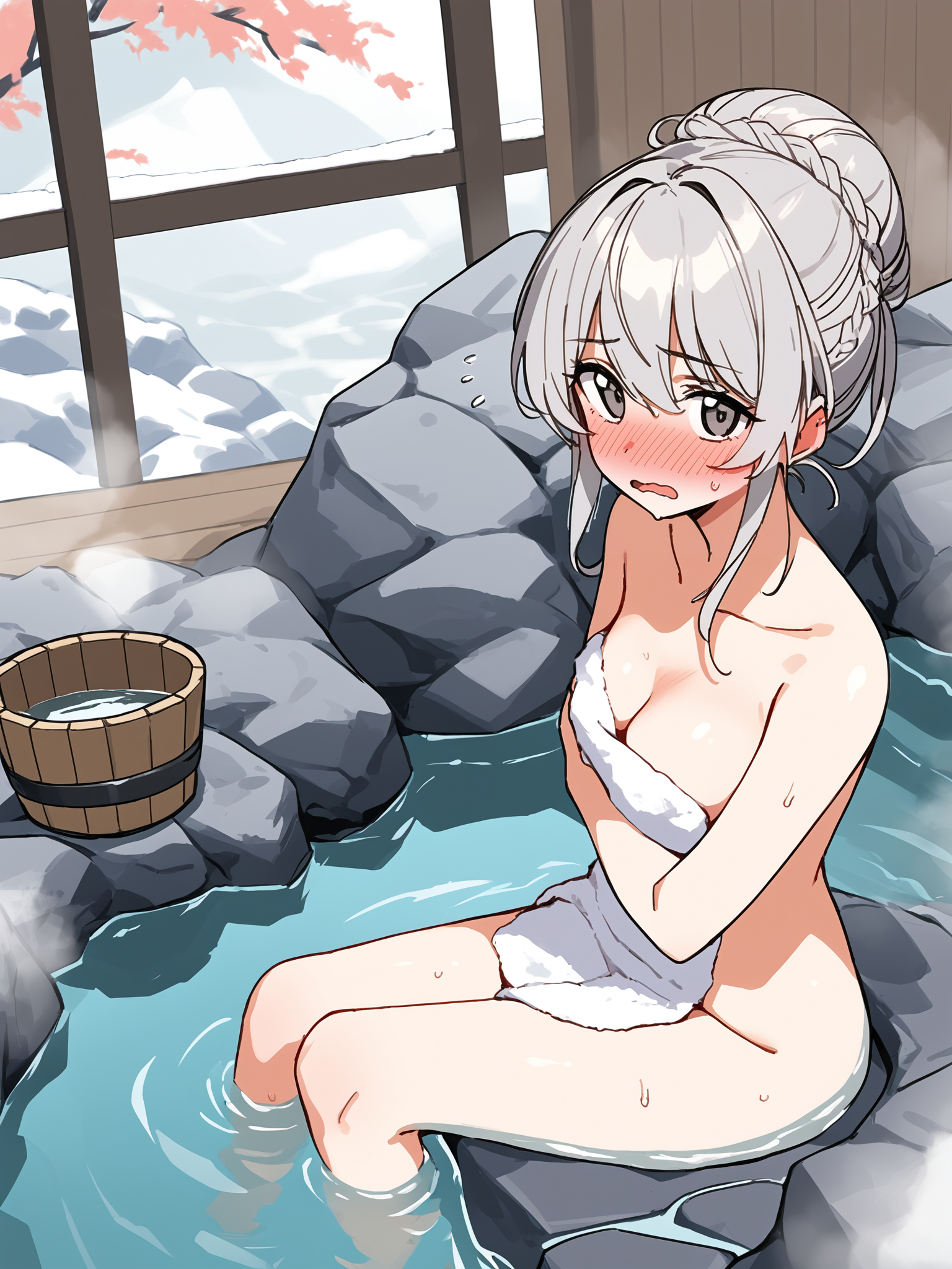 お風呂: 灰色の髪, 灰色の目, 髪を結んだ状態, (三つ編みの団子:1.1), 口を開けた状態, 座っている, 灰色の目, 裸, タオル, 秘部を覆っている, 裸体