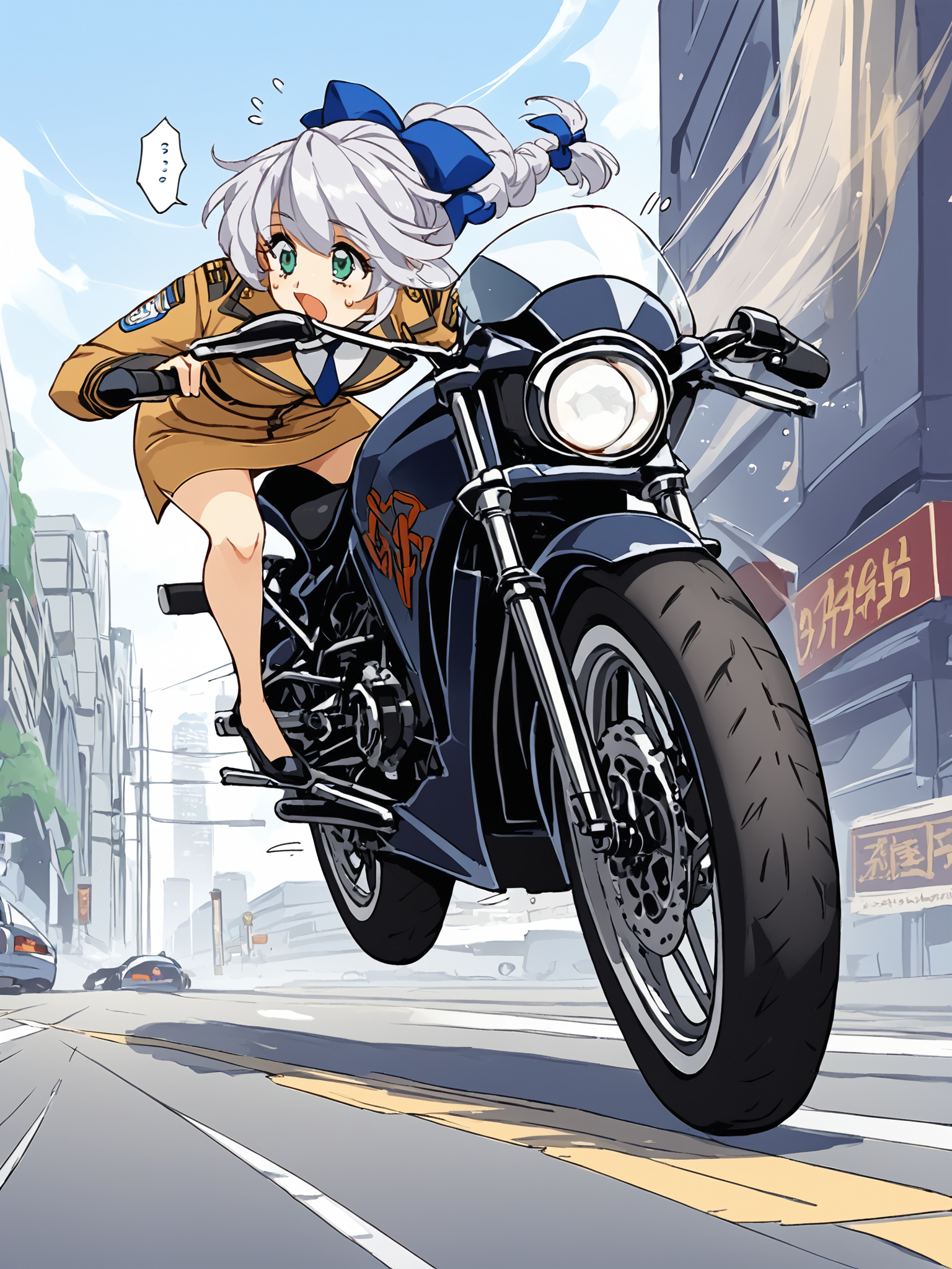 髪の青いリボンが不要なのに描かれてしまう傾向がある。ネガティブに (hair bow, hair ribbon, blue bow:1.5) を試してみてください。