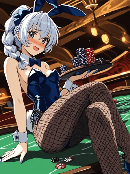 バニースーツ: telethabunny, 灰色の髪, 灰色の目, 青いリボン, 三つ編みポニーテール, プレイボーイベニー, 外れカラー, 青いウサギの耳, 手首カフス, 青いネクタイ, 青いレオタード, (フィッシュネットパンティーホース:1.2), 黒いパンティーホース, 太もも間, ブラストレッピングレオタード, 髪が肩にかかる, 青い靴, (ハイヒール:1.5), 青い爪, 小さな胸,