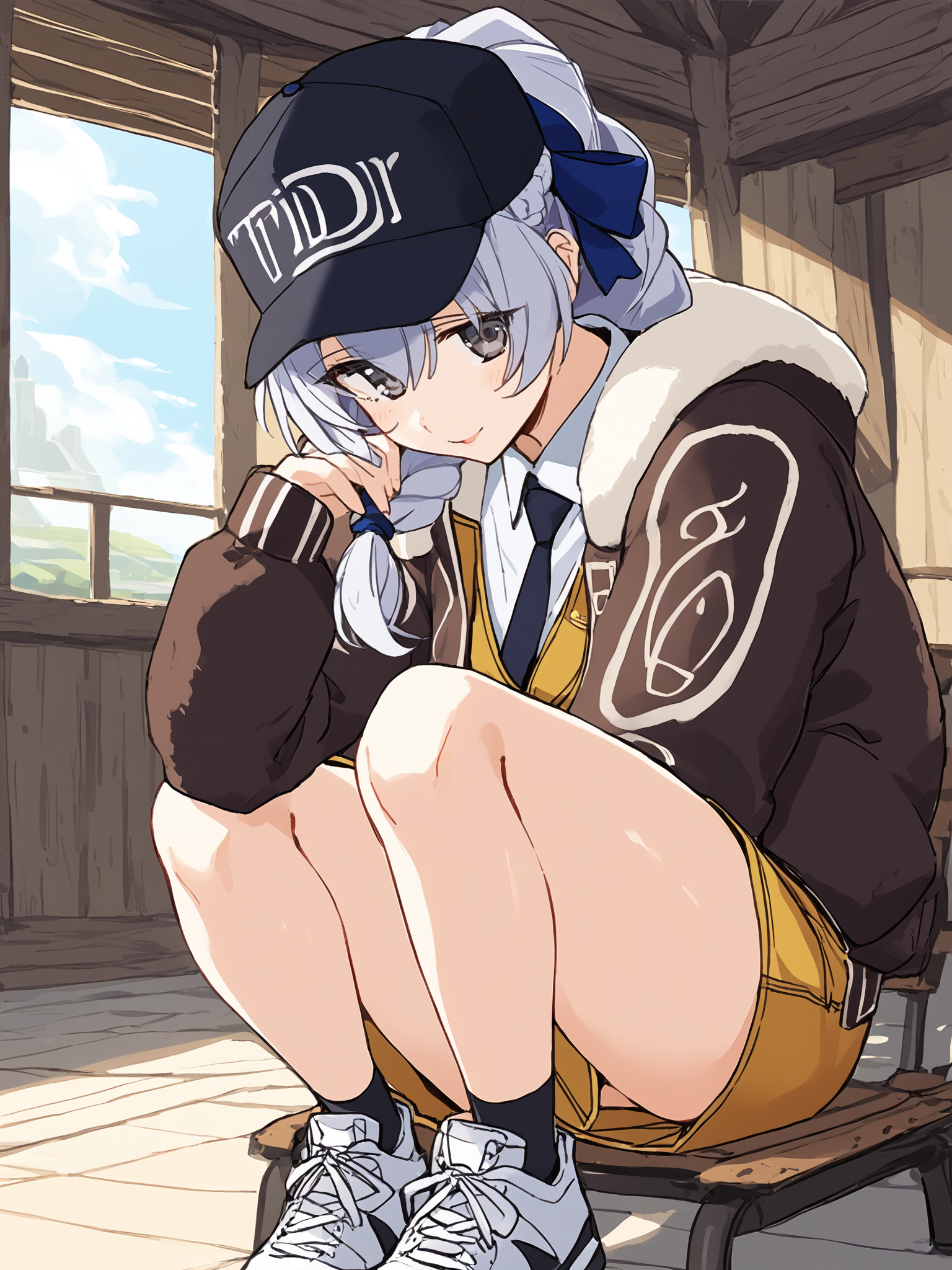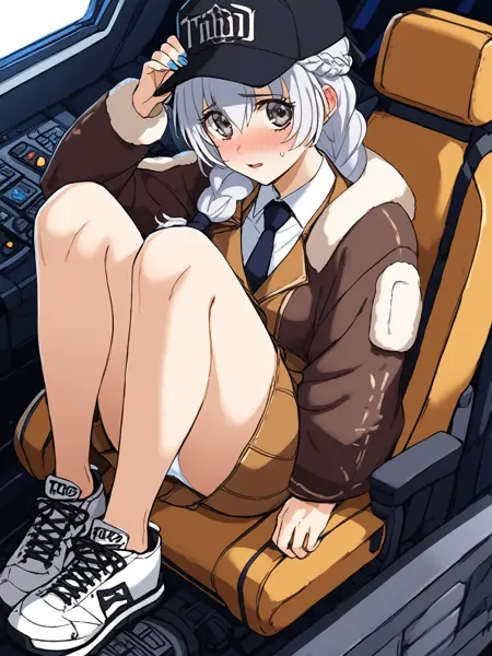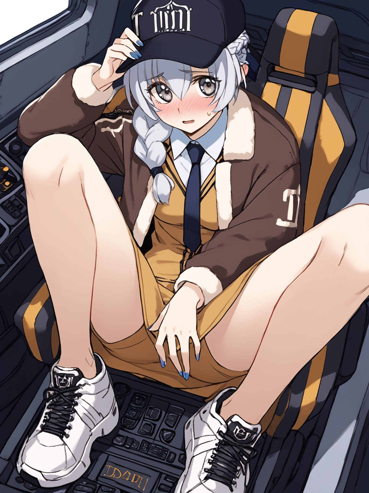 ボマージャケット付きミリタリー制服: telethacapn, 長袖, 白シャツ, ポロシャツ, 灰色の髪, 三つ編み, ネクタイ, 灰色の目, 低いポニーテール, (単一の三つ編み:1.5), (ミリタリー制服, ウィングカラー:1.2), 黒ネクタイ, 髪が肩にかかる, 茶色のジャケット, 茶色のスカート, 鉛筆スカート, ミニスカート, エンブレム, 裸足, 太もも, (白いスニーカー:1.3), (ボマージャケット:1.4), 開いたジャケット, 茶色のジャケット, 黒いキャップ,