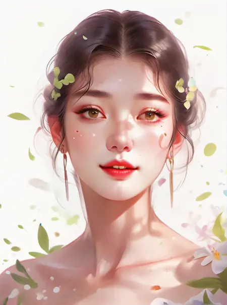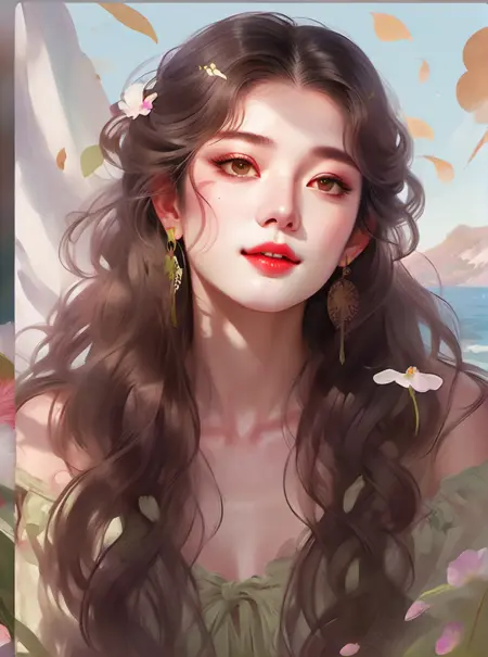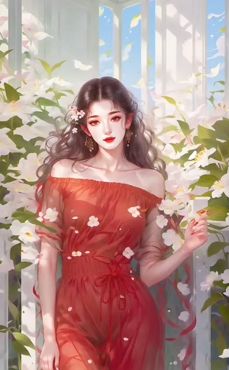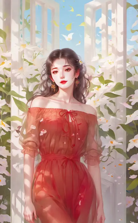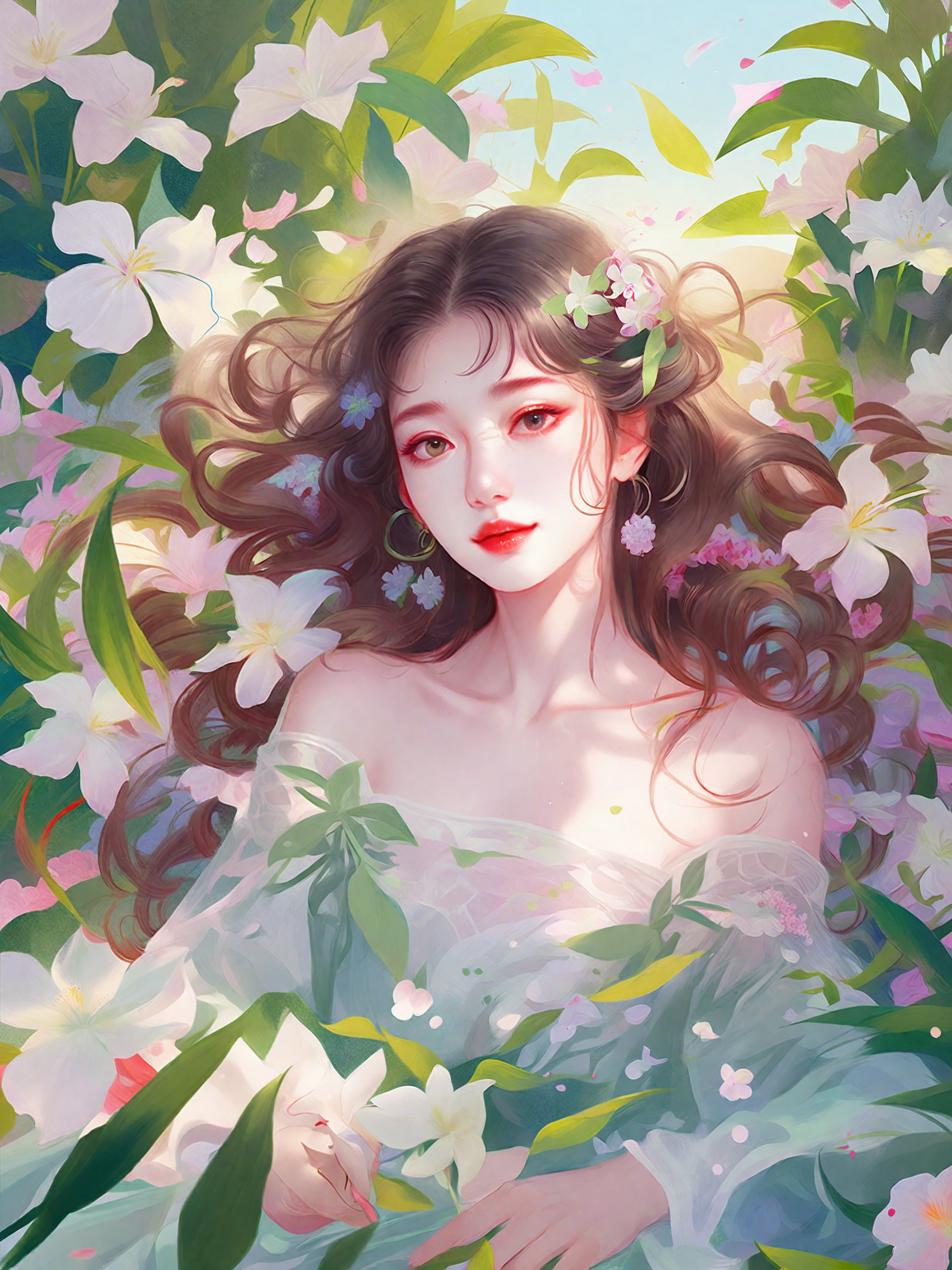 In the embrace of daylight, nature's poem unfolds like a song. Delicate petals and leaves sway gently in the breeze, reminiscent of a dream. The young girl is adorned in ethereal, translucent chiffon, gently wrapped in the interplay of light and shadow. The foliage rustles softly, and sunlight filters through the delicate fabric, creating a tranquil and beautiful world of light and shadow. In this captivating moment, nature's poetry softly sings, painting a picture of serene beauty that captivates the soul.