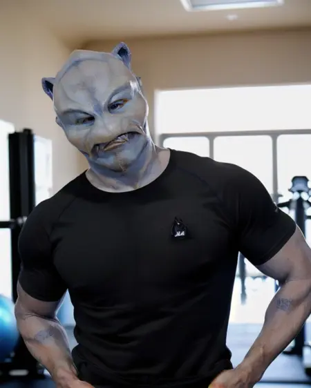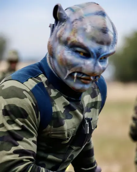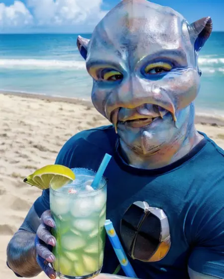 키워드는 benzite입니다. 학습에 사용된 다른 문구: alien, blue skin, flat nose, short catfish whiskers around mouth, wearing device on chest in front of mouth.