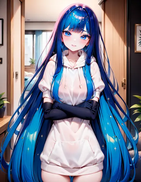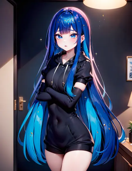 关键词有:“LapisLazuli、水晶发丝、极长发、闪耀、齐刘海、黑色手套、肘部手套、蓬松袖子、领结”。