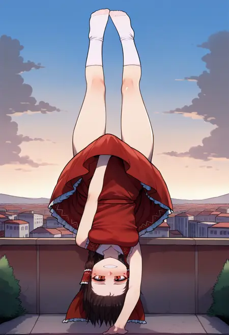 lycoris challenge (meme), upside-down, one arm handstand, covering privates, covering crotch