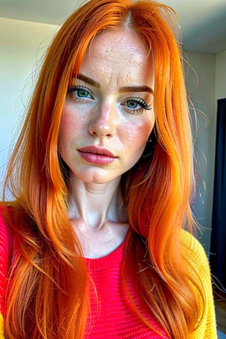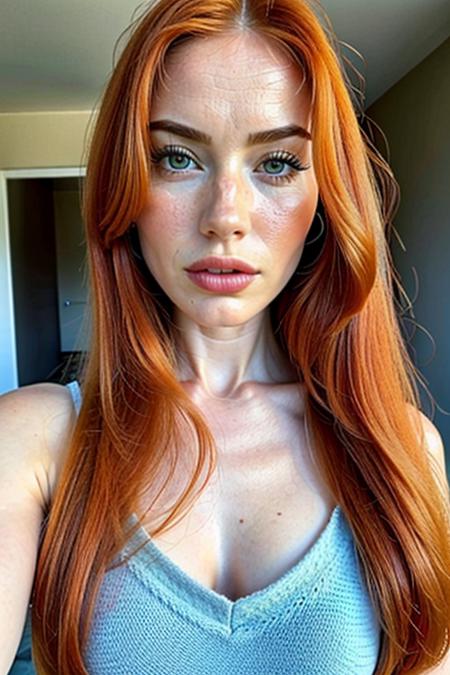 레드 헤어, 파란 눈, 하얀 피부, 덜한 주근깨를 가진 실제적인 여성, 인스타그램 인플루언서, 벨라루스인
