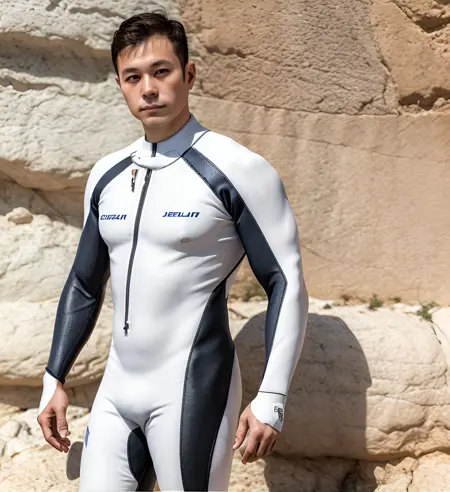 빨간 스쿠버 스우트를 입은 바이킹 남자, 해변