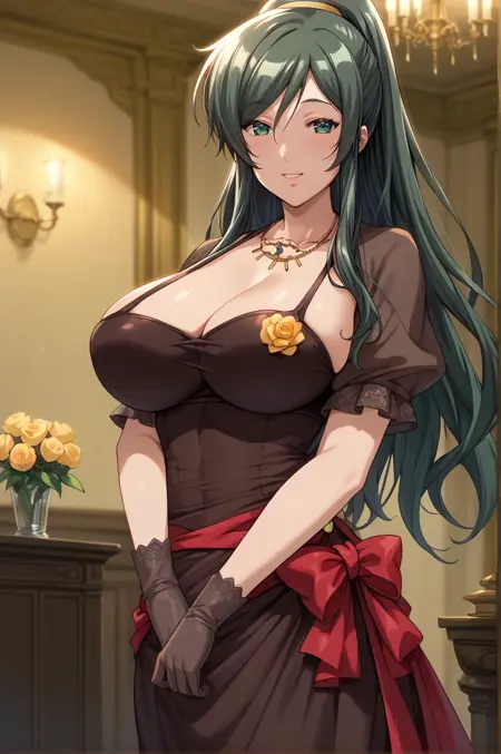 深V领口,棕色手套,棕色连衣裙,项链,珠宝,花朵胸针,黄色玫瑰,黑色过膝袜,黑色鞋履,高跟鞋