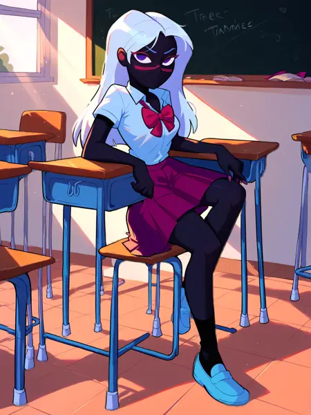 Prompt base: queen tyr'ahnee, black_skin, white_hair, purple_eyes
