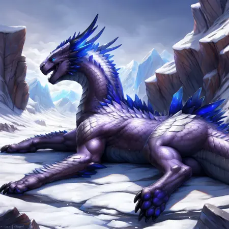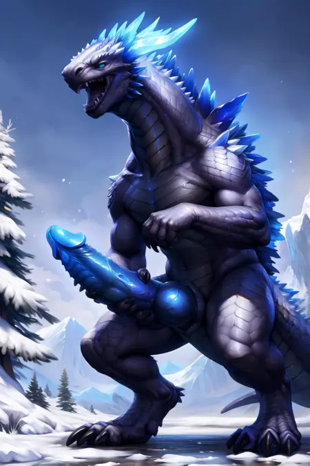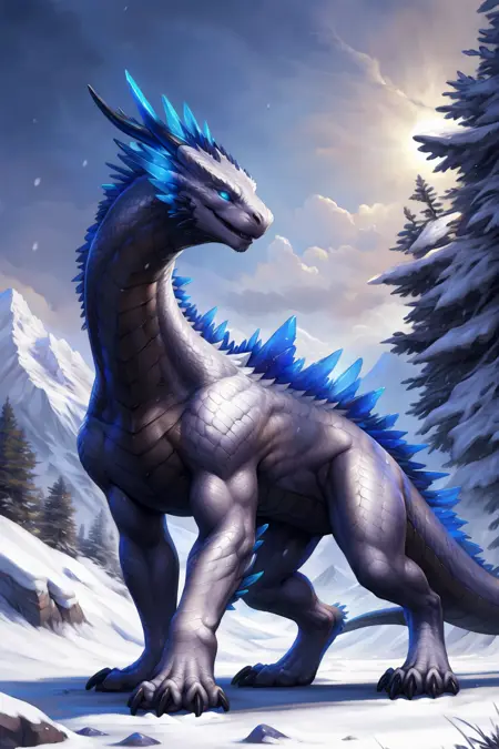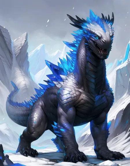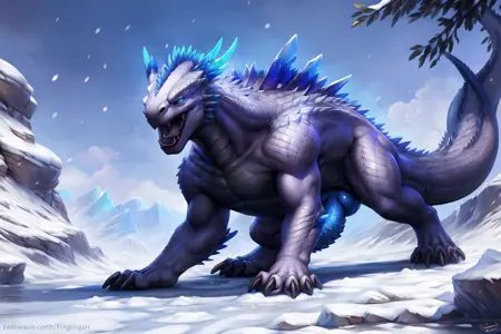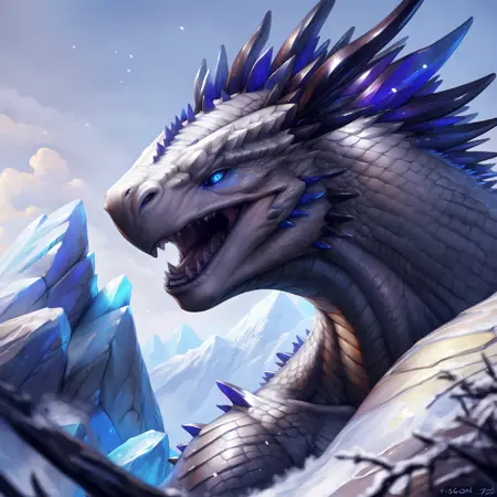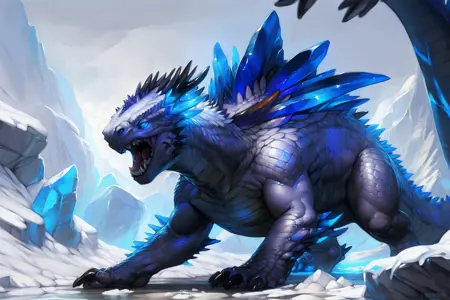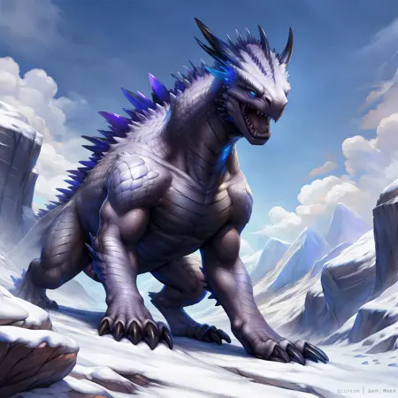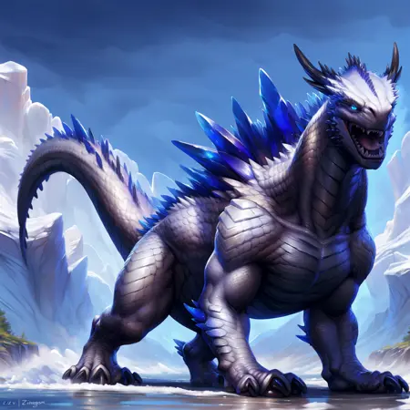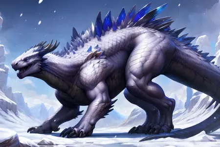 推荐正面提示词:希莫、冰、蓝色水晶、发光的眼睛、蓝色眼睛、肌肉发达、爪子、银色皮肤、银色鳞片、全身、一条尾巴