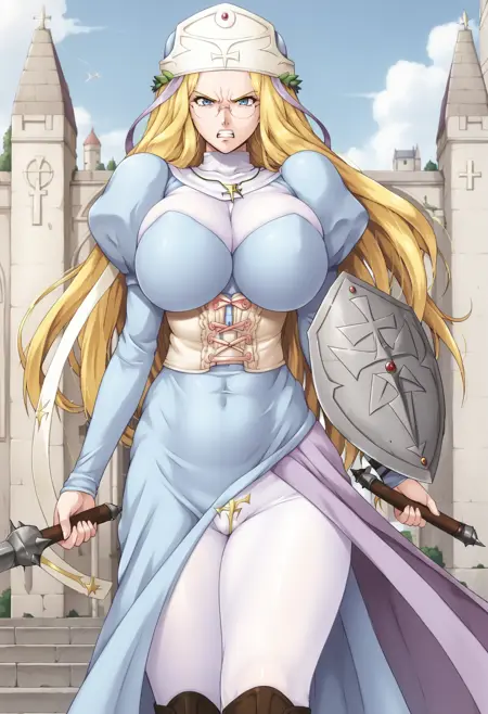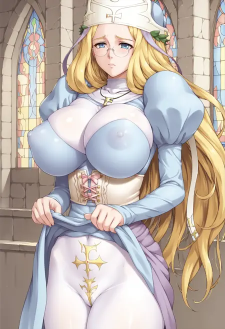 두드러진 태그: 긴 머리, 금발, 파란 눈, 안경, 신부, 멀트, 흰색 머리장식, 파란 드레스, 긴 소매, 볼륨 있는 소매, 흰색 팬티스타킹, 코르셋, 부츠,