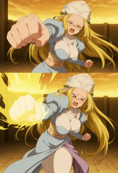 显著标签:长发、金发、蓝眼睛、眼镜、牧师、主教冠、白色头饰、蓝色连衣裙、长袖、蓬松袖子、白色连裤袜、紧身胸衣、靴子