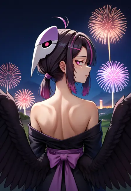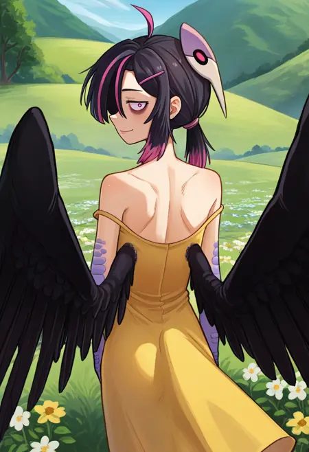 触发词 + 外观: omava, 怪物女孩, 翼人, 黑色翅膀, 羽毛翅膀, 翼臂, 鸟腿, 爪子, 天线发, 发夹