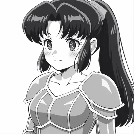 アーマー:urusei_asukaxl、アーマー、ポニーテール、青い目、シンボル形の瞳孔、長い髪、紫髪、黒髪、ツートンヘア